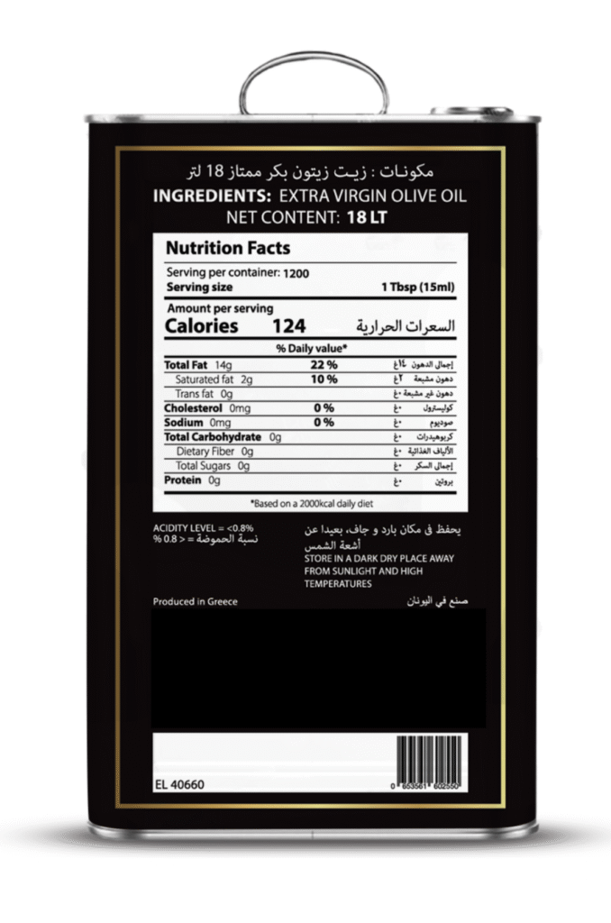 Nome del Prodotto: Deve essere “Zait” (olio di oliva) o “Zait extra virgin” (olio extravergine di oliva).
